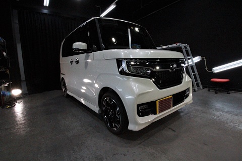 ホンダNボックスのご入庫です! ボディカラーはプレミアムホワイトパール! 施工はボディに