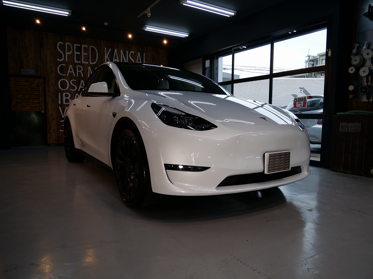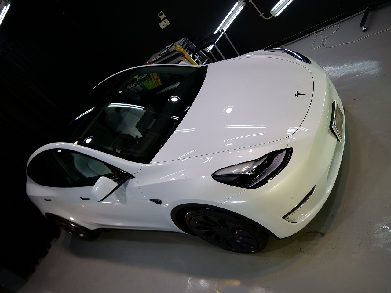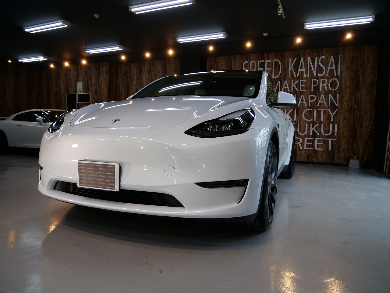 大阪府高槻市よりテスラ モデルYのご入庫です!ボディカラーはパールホワイトマルチコート!施工は