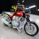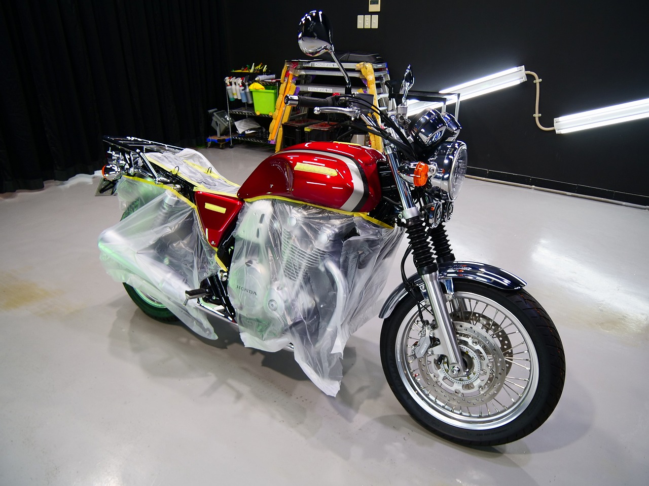 ガラスコーティングを吹き付け、タンクやマフラー、シートにはセラミックプロをコーティング施工!