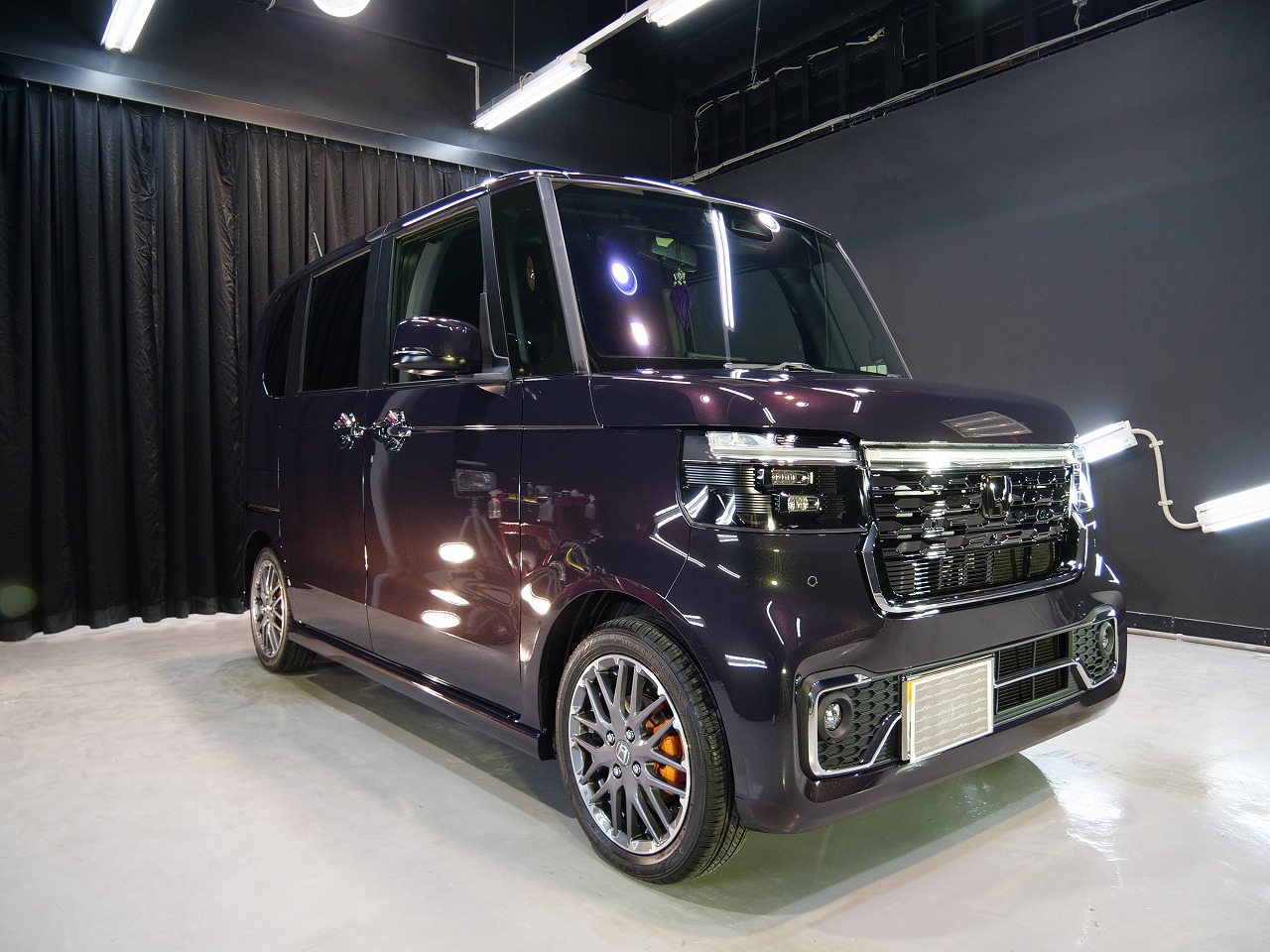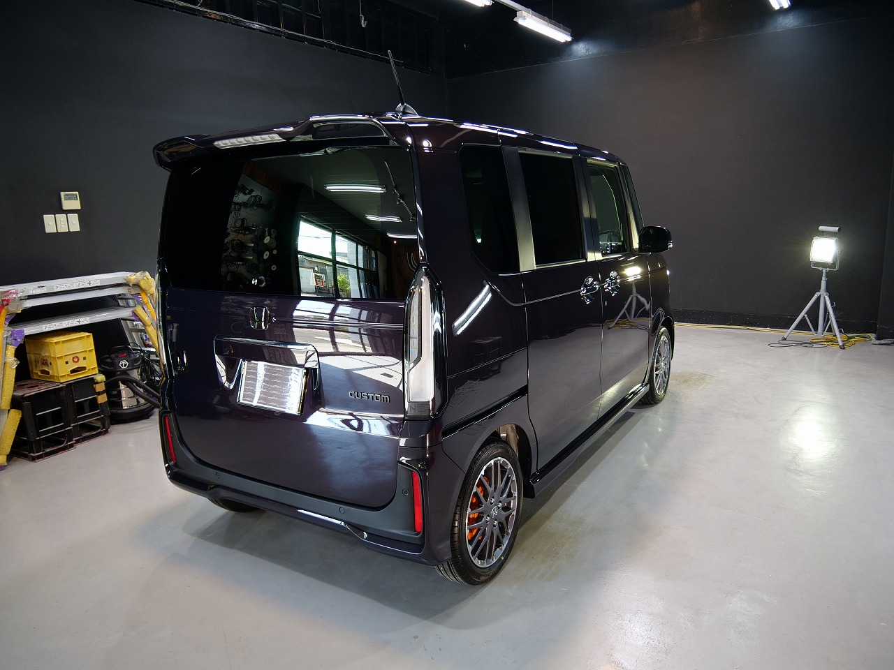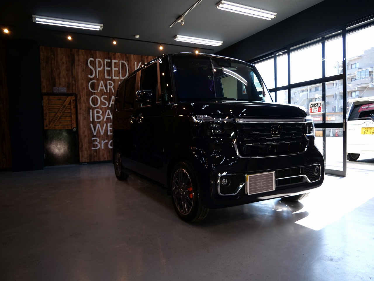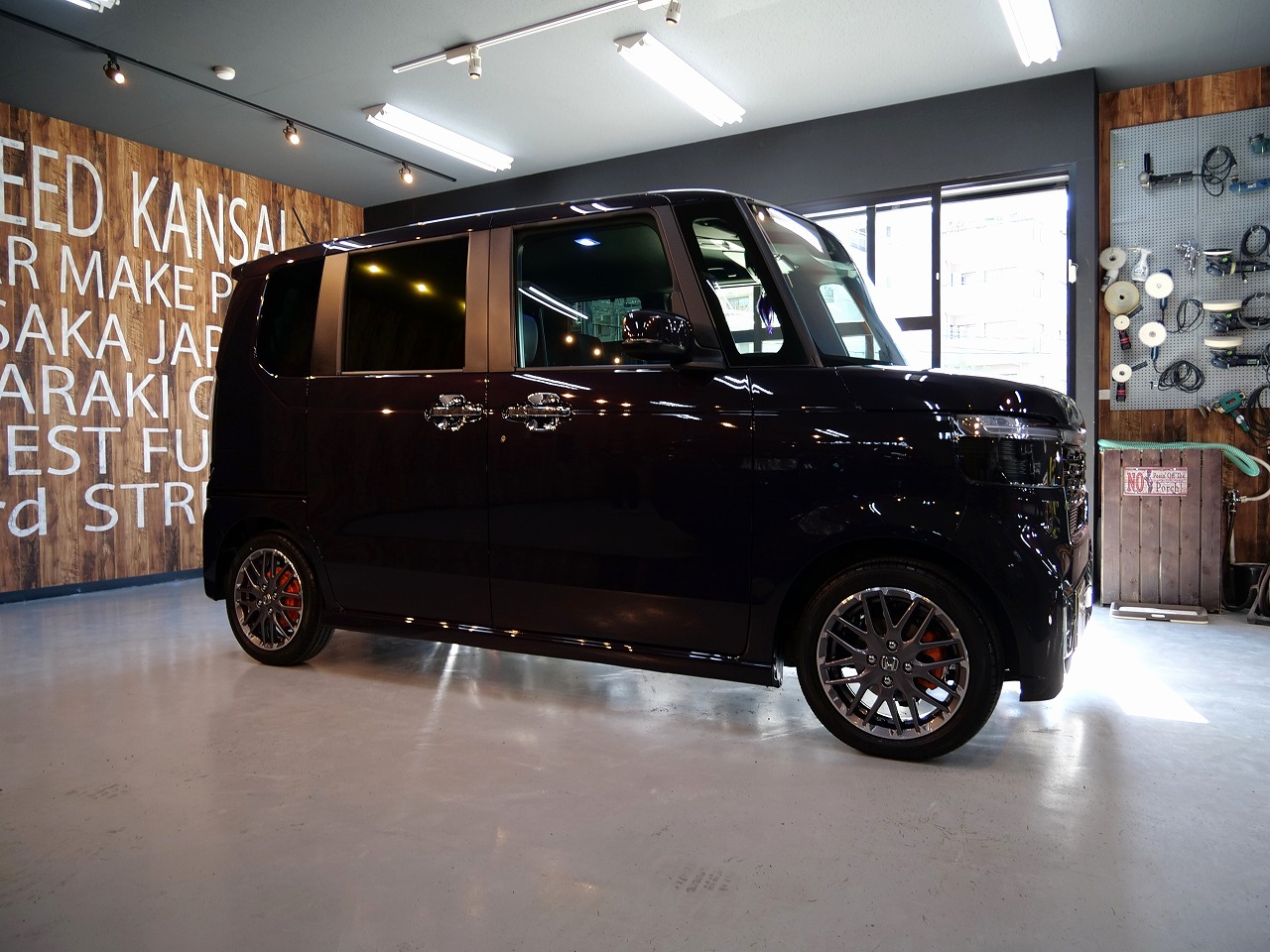 大阪府茨木市よりホンダN-BOXカスタムのご入庫です!ボディカラーはトワイライトミストブラック