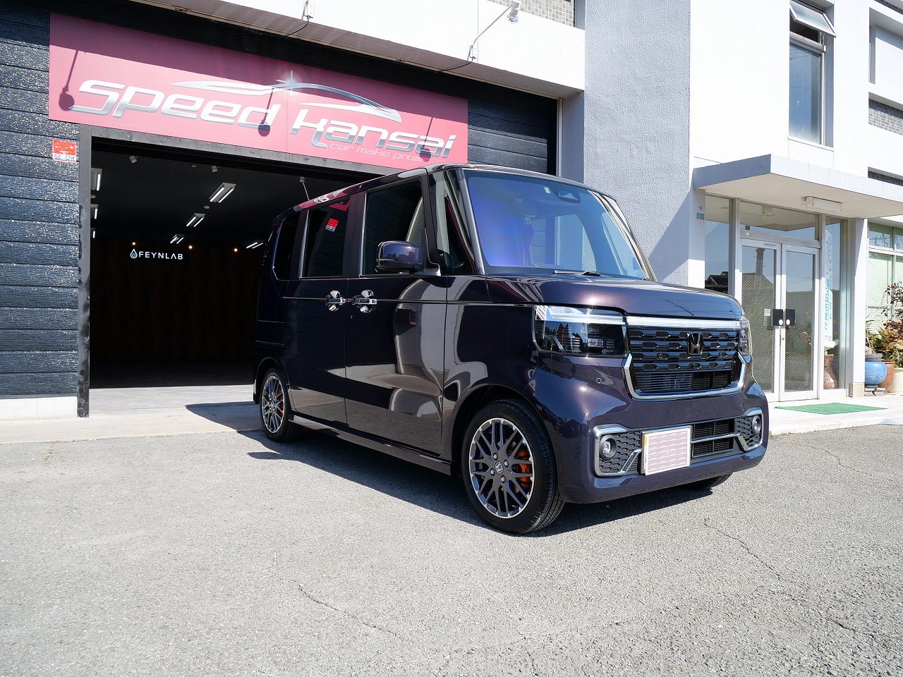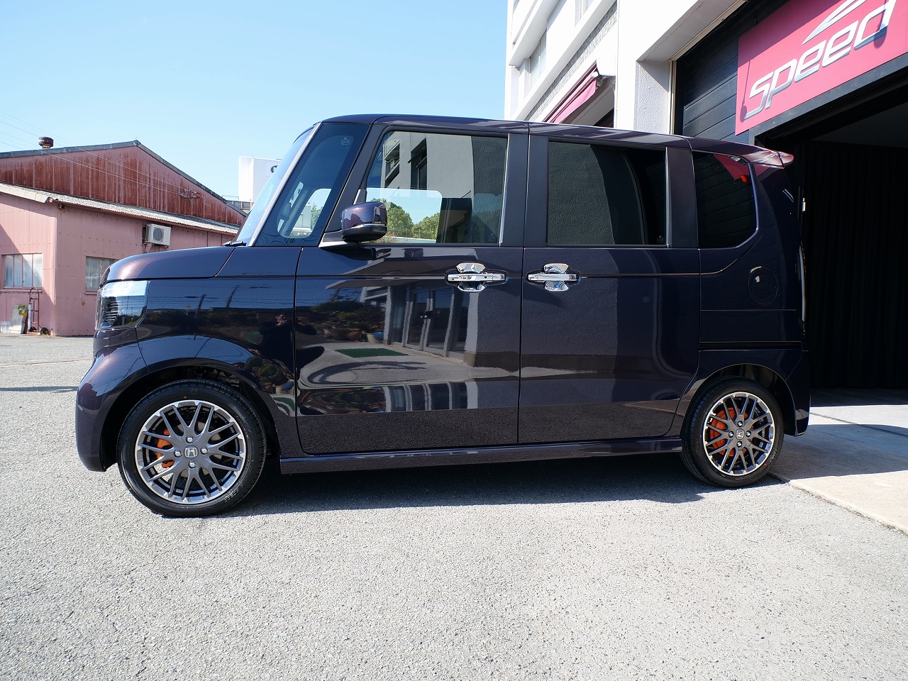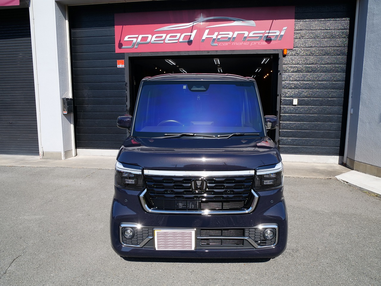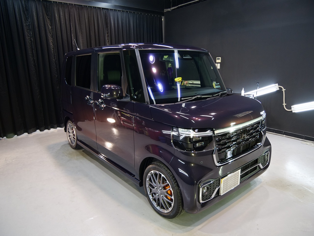 大阪府茨木市よりホンダN-BOXカスタムのご入庫です!ボディカラーはトワイライトミストブラック