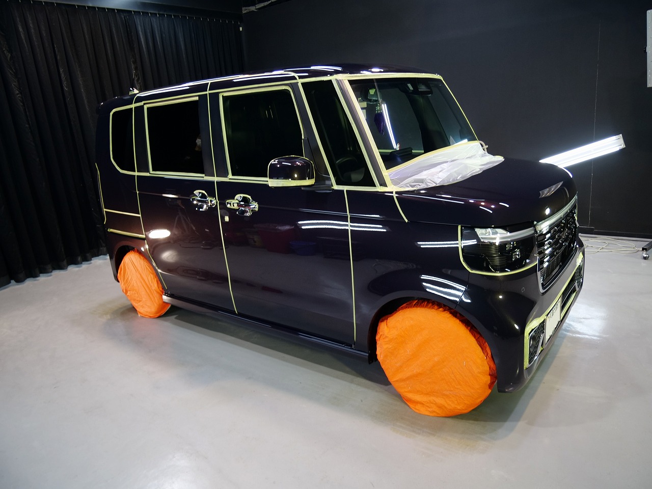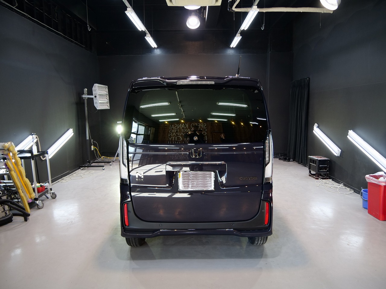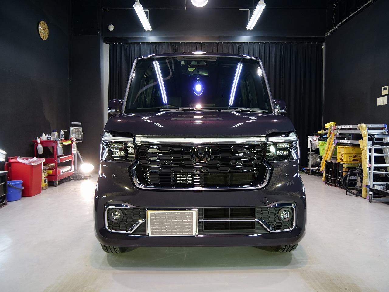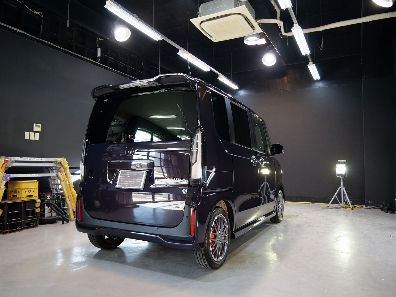 大阪府茨木市よりホンダN-BOXカスタムのご入庫です!ボディカラーはトワイライトミストブラック