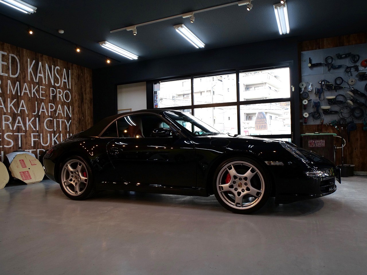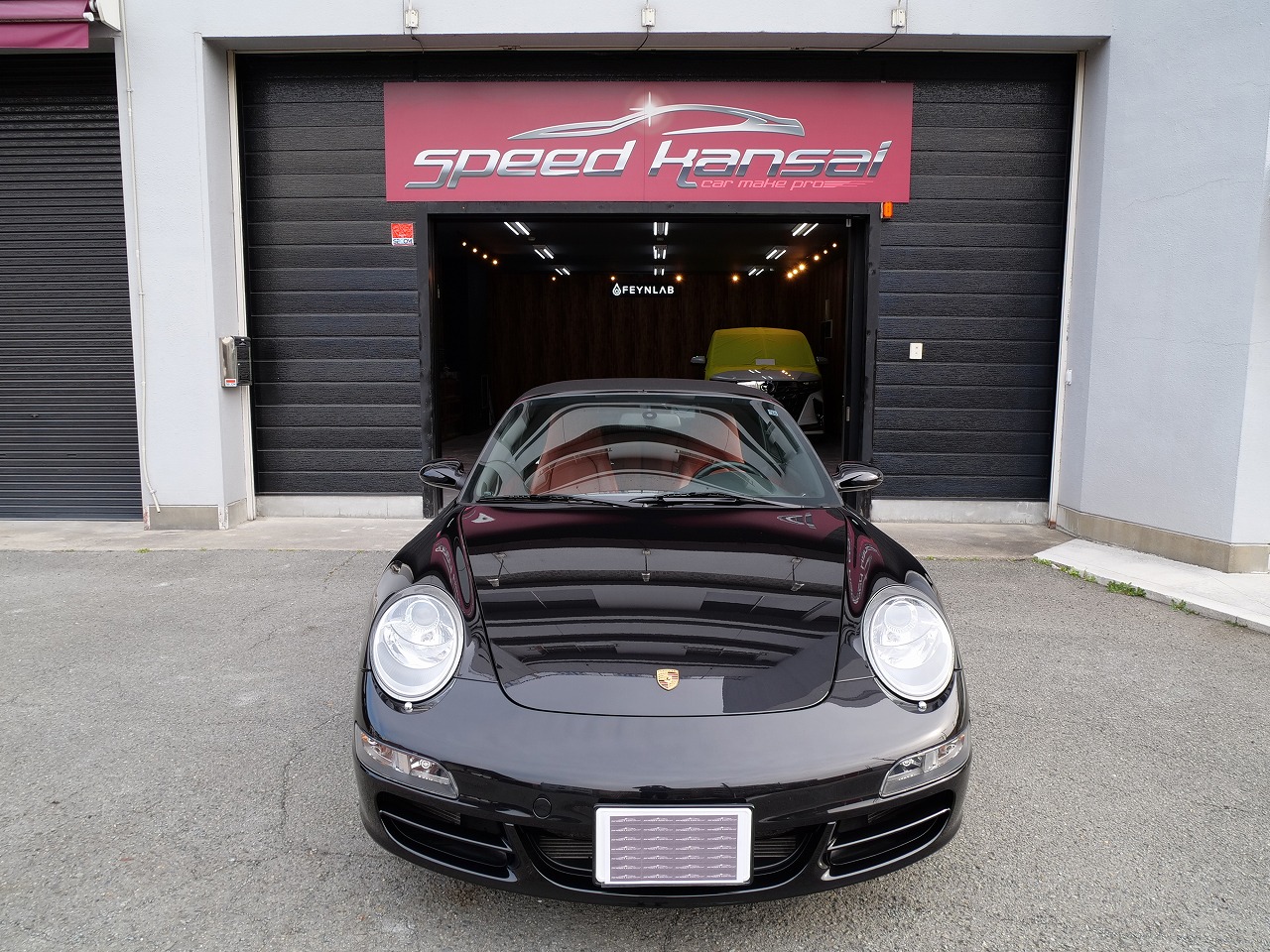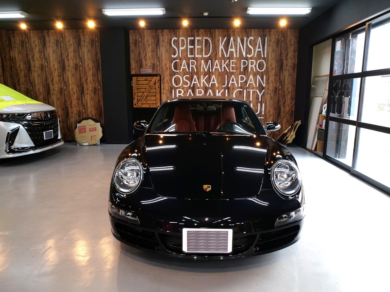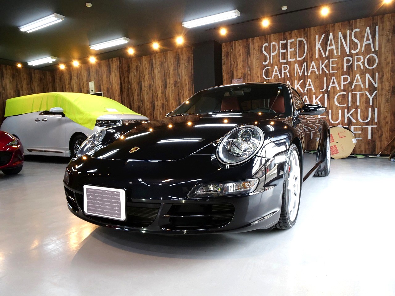 大阪府大阪市よりポルシェ997カレラSのご入庫です!ボディカラーはバサルトブラック。施工はボディ