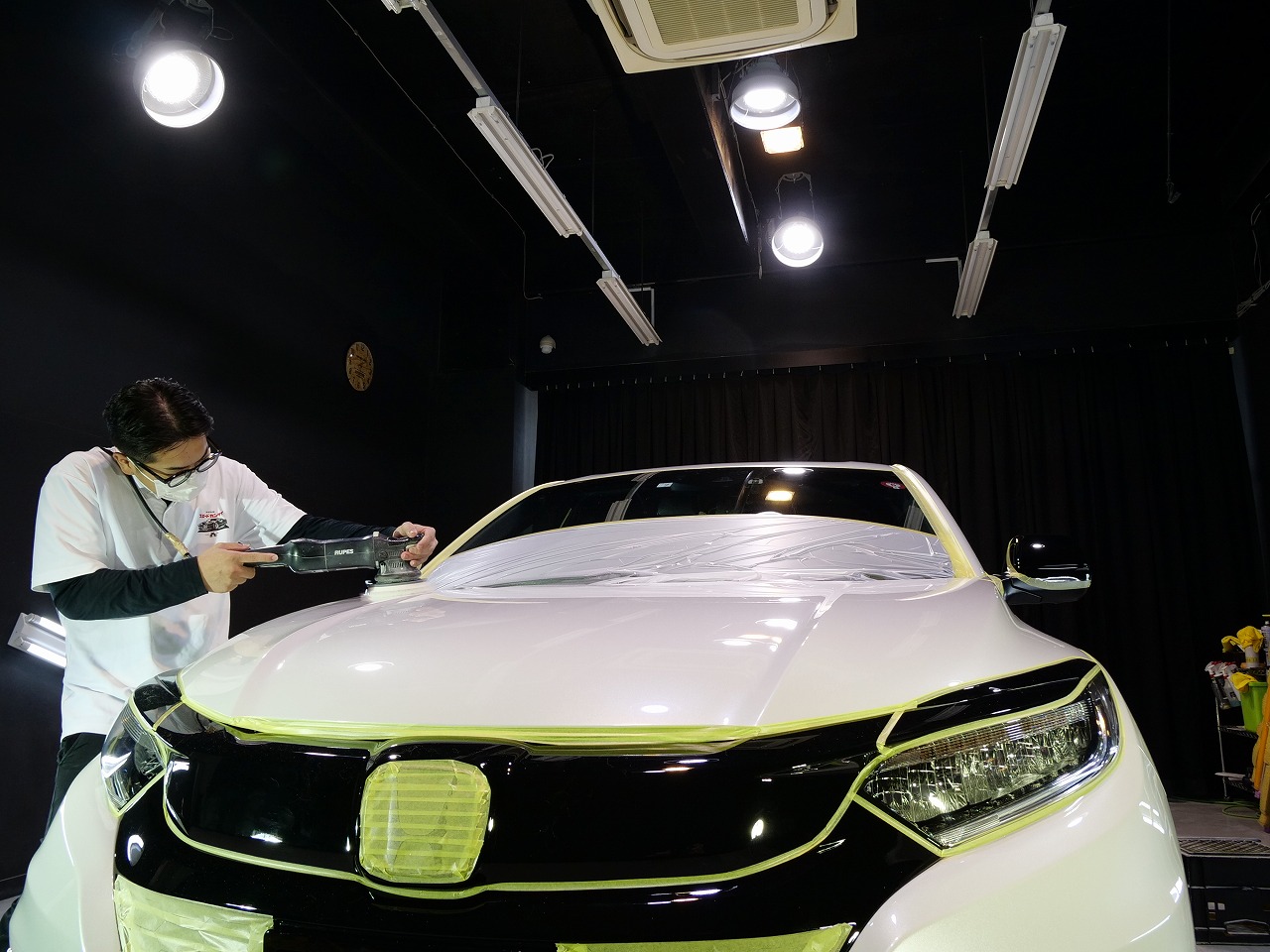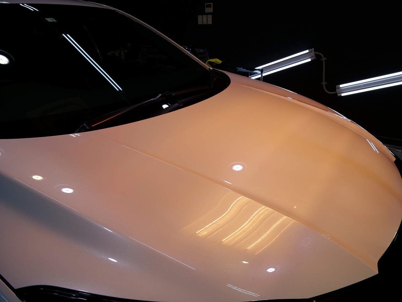 パールホワイト。施工はボディにはG’ZOXリアルガラスコートM/ホイールコーティング/フロント