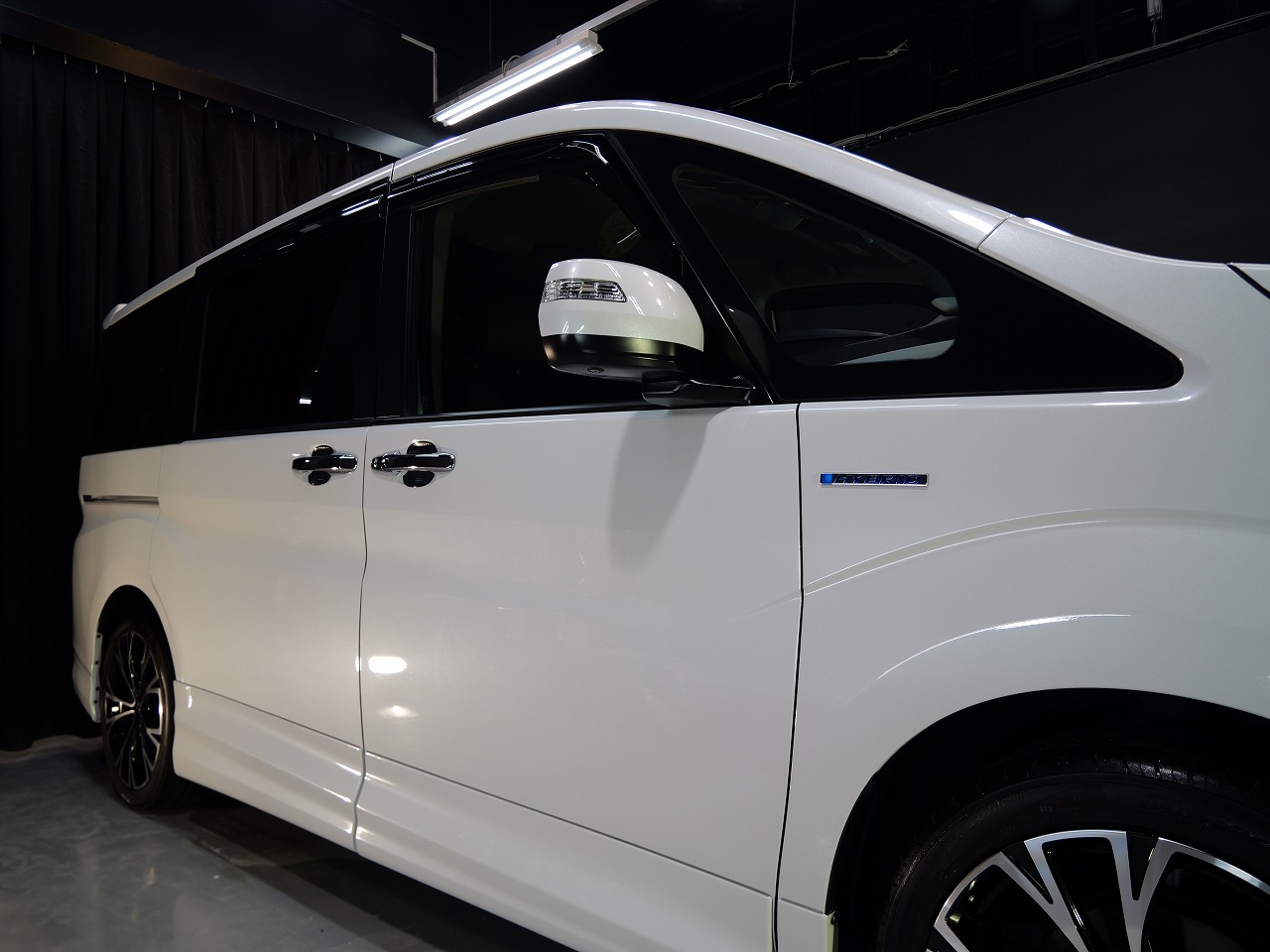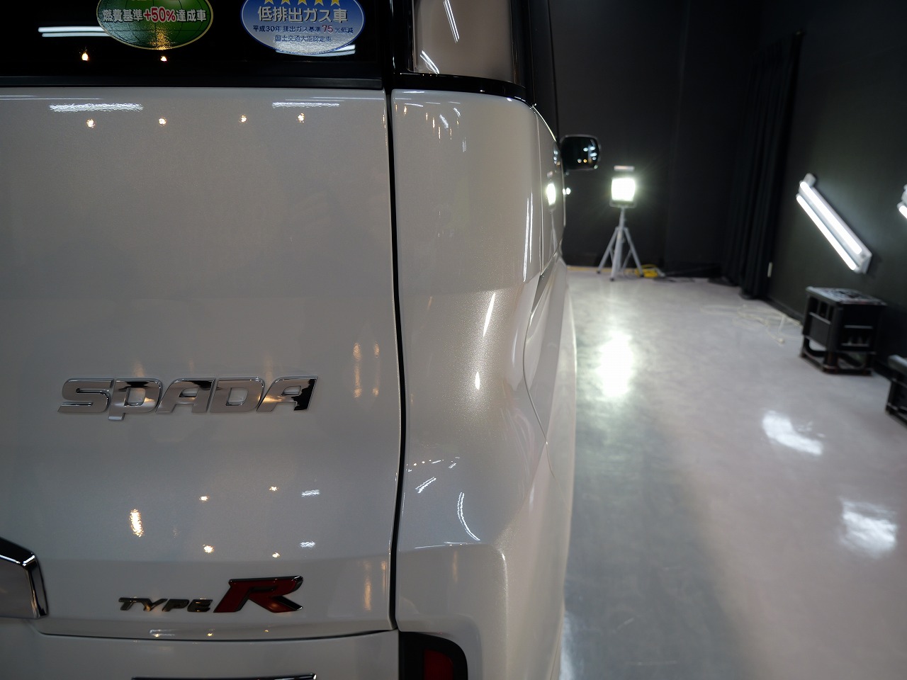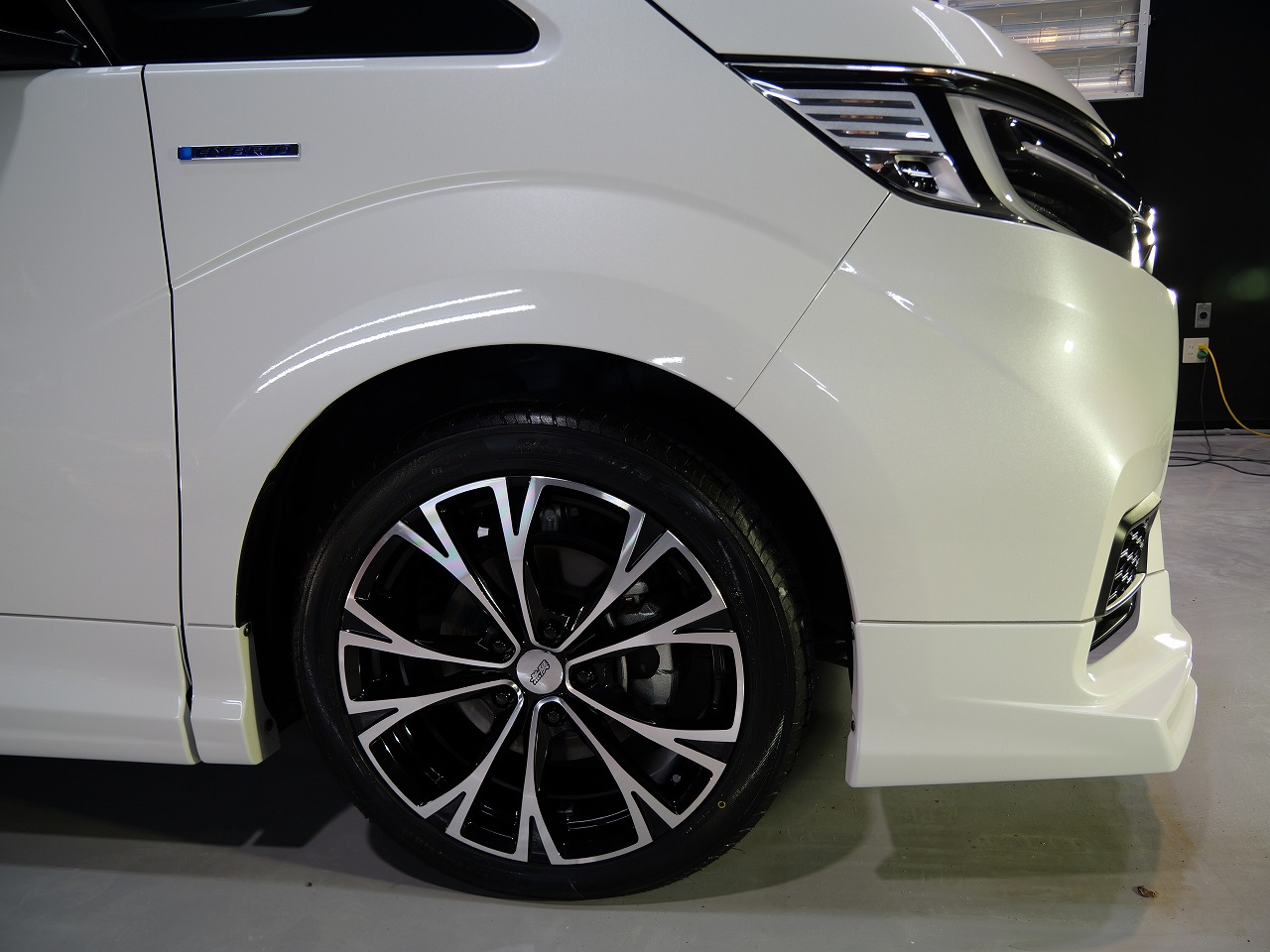 ホワイトパール。施工はボディにはクォーツガラスコーティング/ホイールコーティング/未塗装樹脂