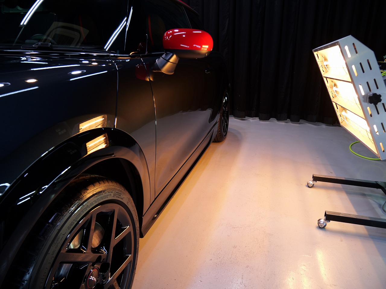 グレー&レッド。施工はボディにはファインラボセラミックコーティングウルトラ2層/ウィンドウフィ