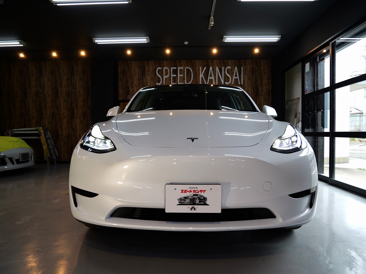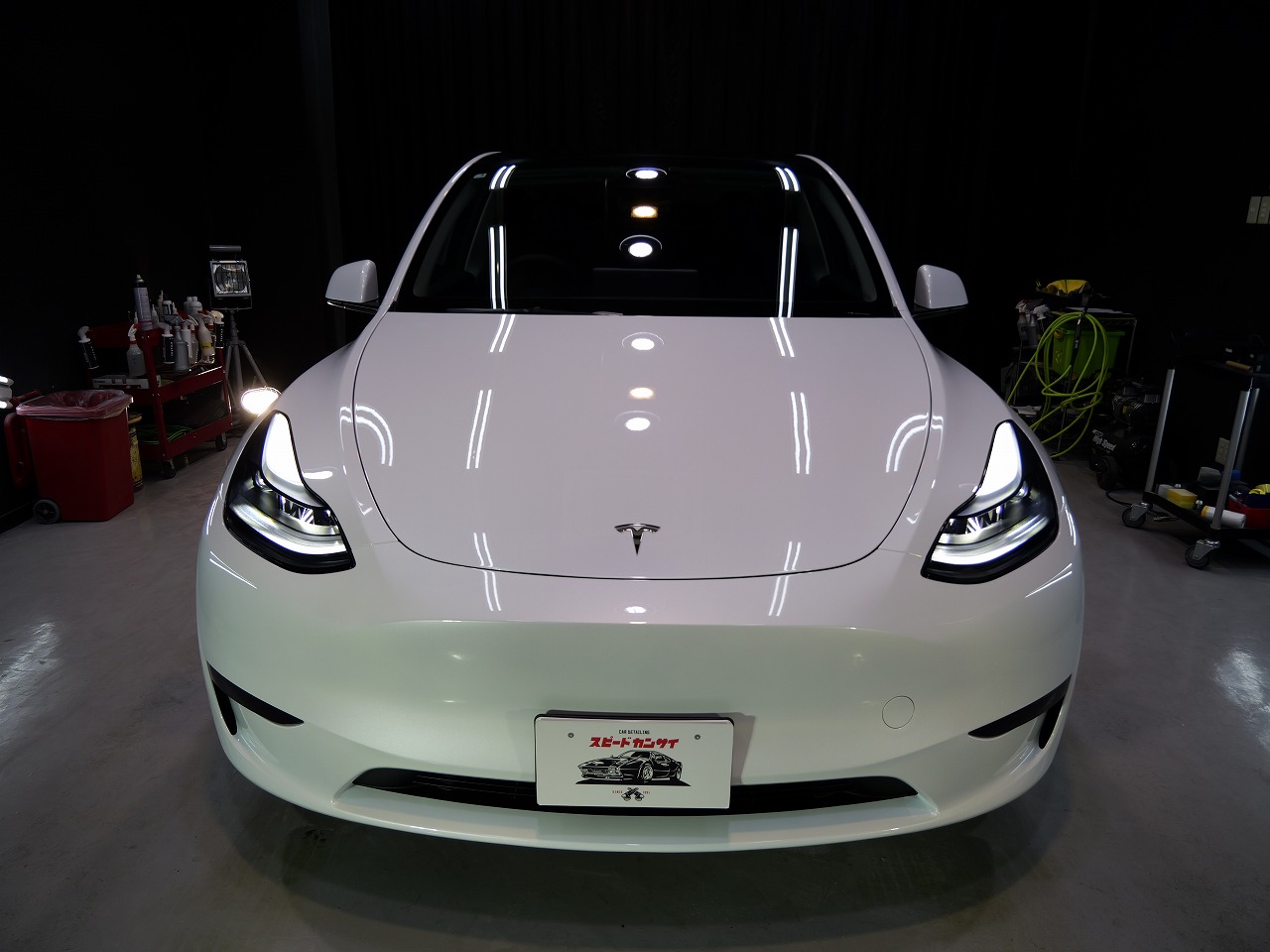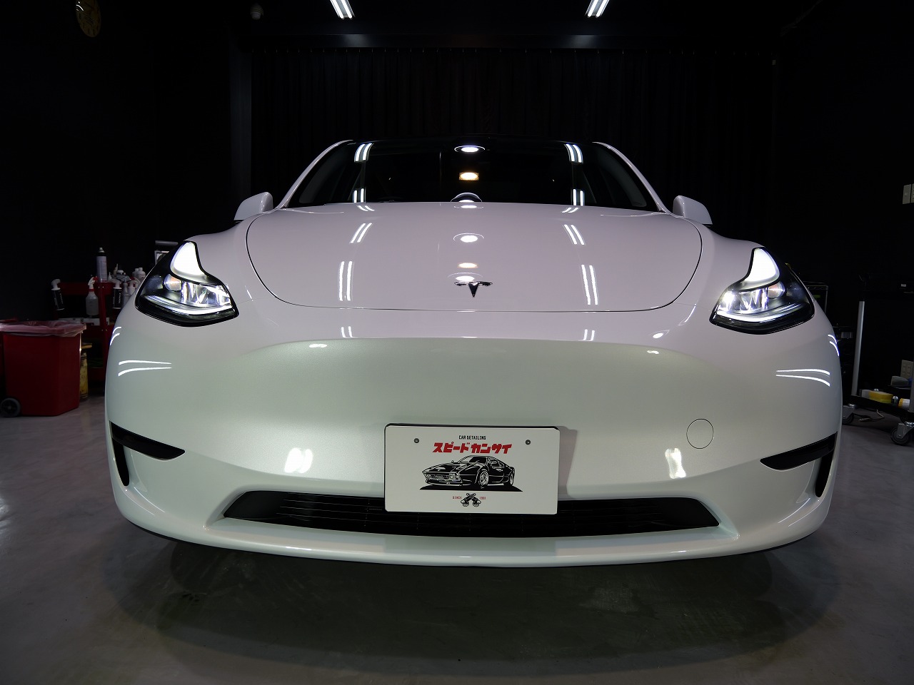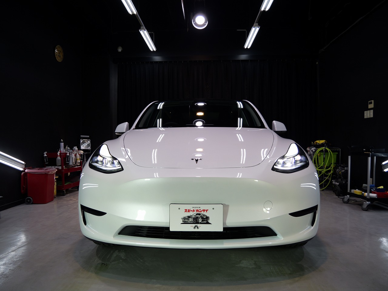 大阪府松原市よりテスラ モデルYのご入庫です!ボディカラーはパールホワイトマルチコート。施工は