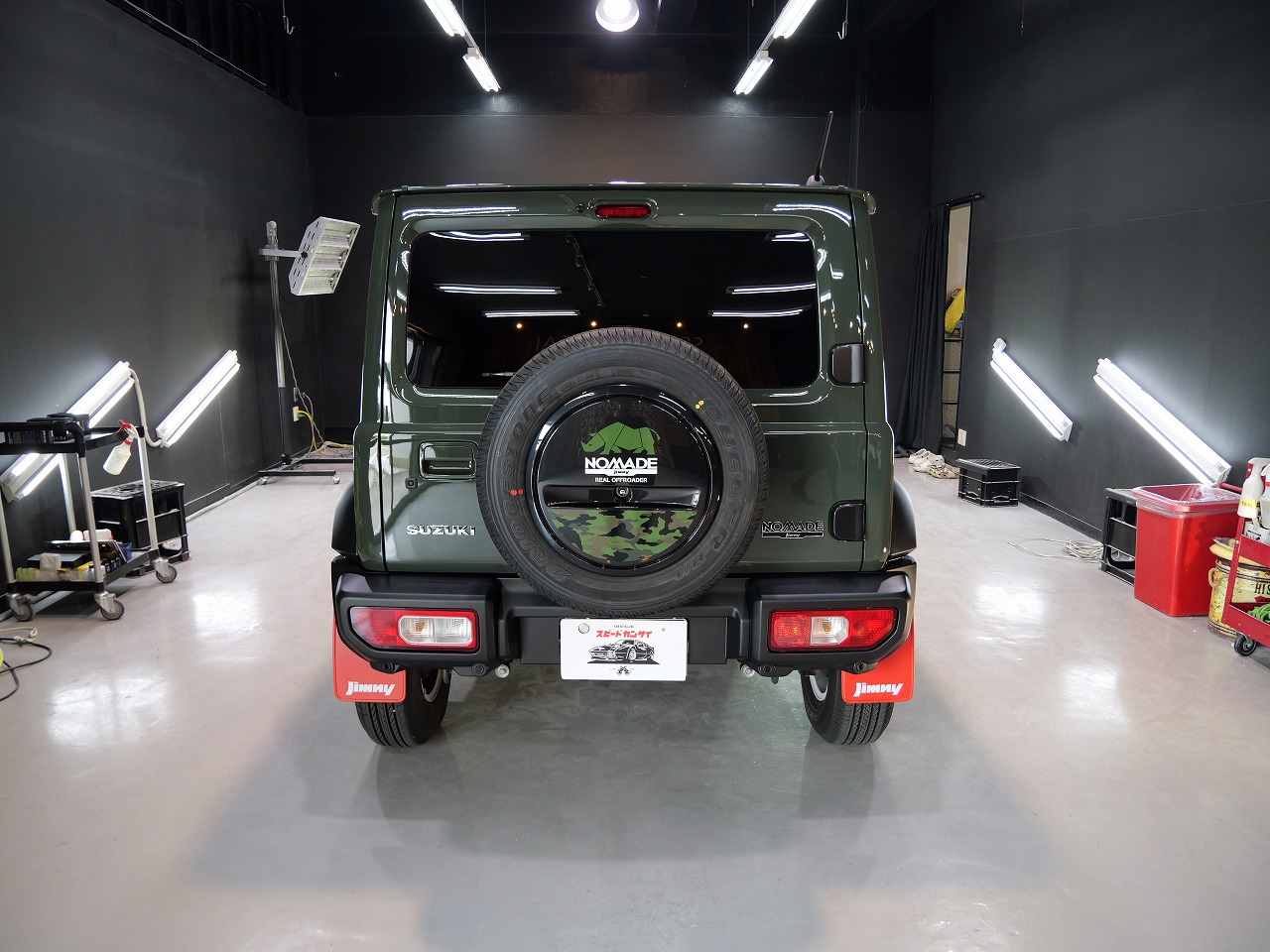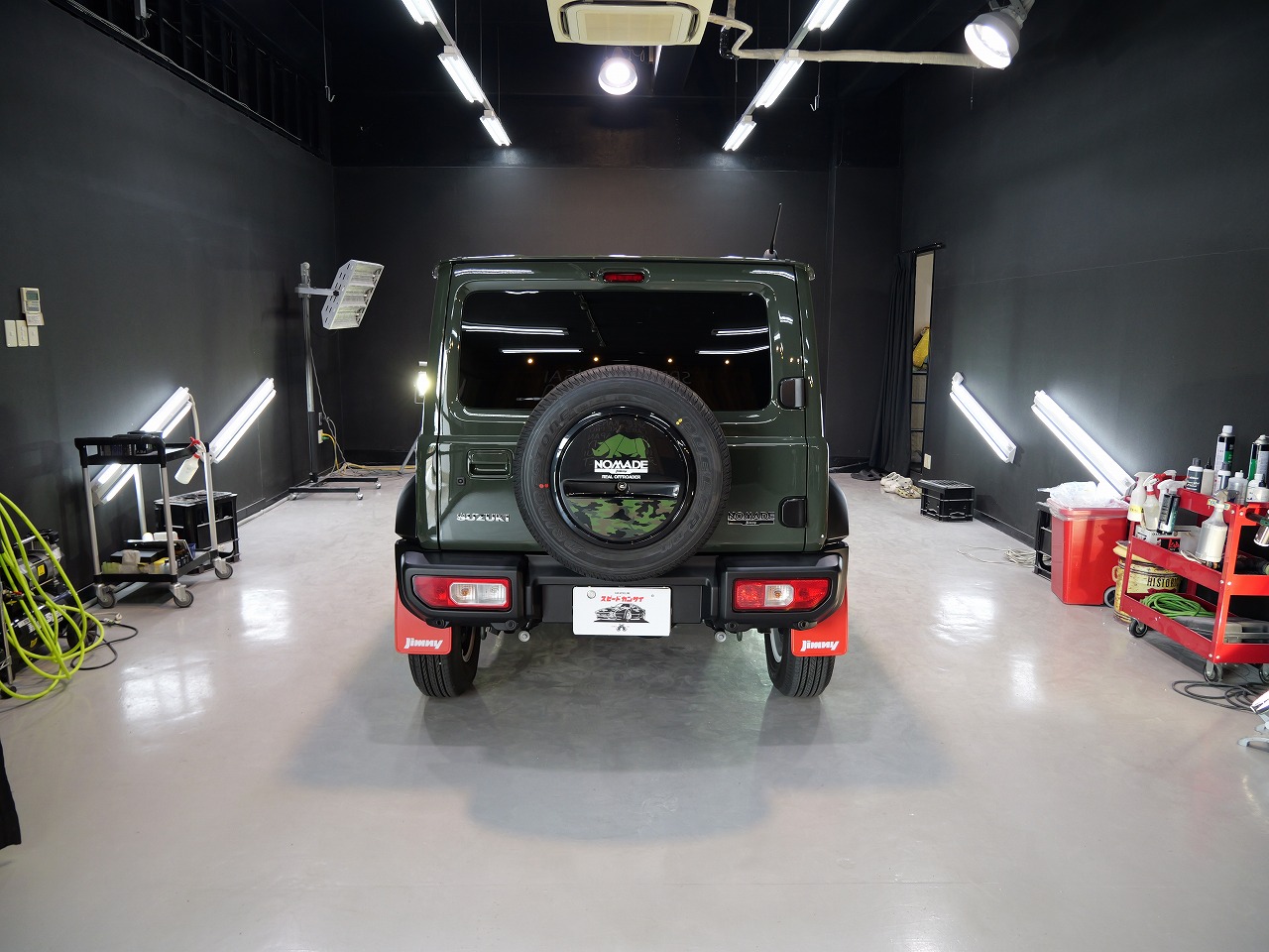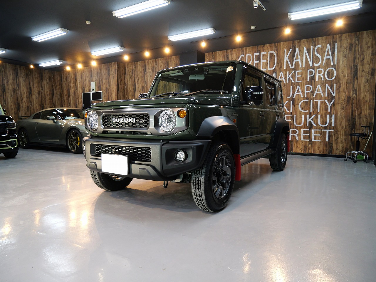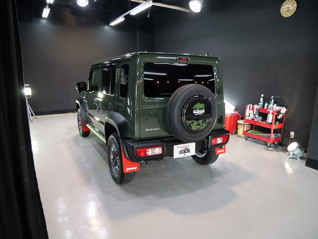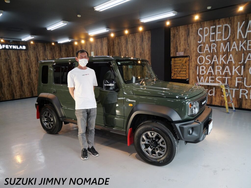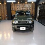 大阪府高槻市よりスズキジムニーノマドのご入庫です!ボディカラーはジャングルグリーン。施工は