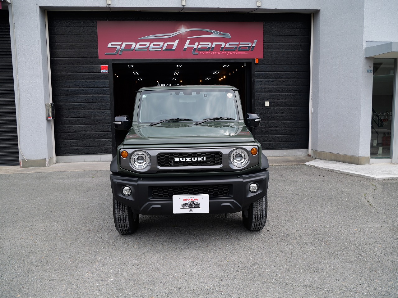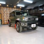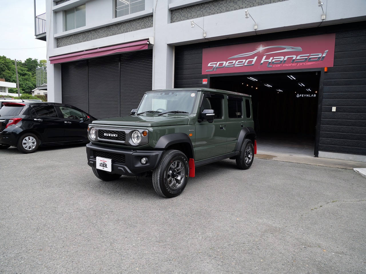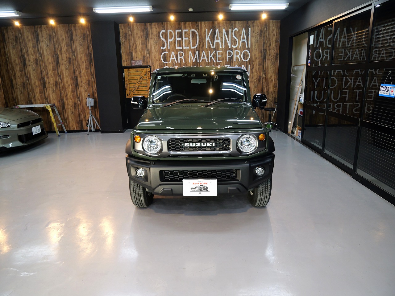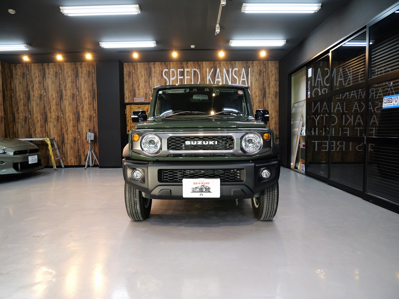 大阪府高槻市よりスズキジムニーノマドのご入庫です!ボディカラーはジャングルグリーン。施工は