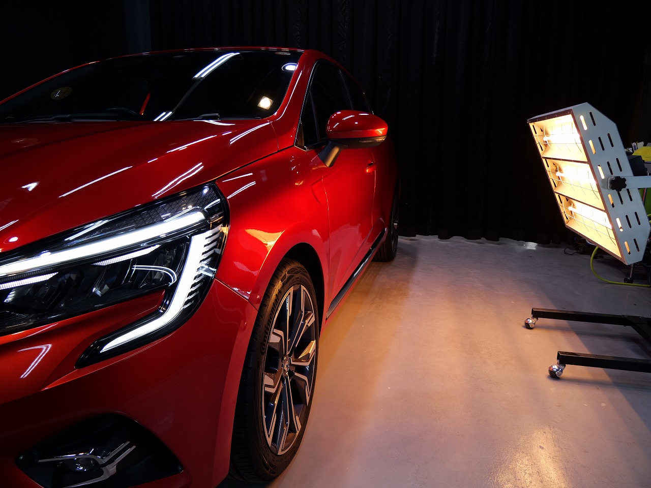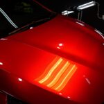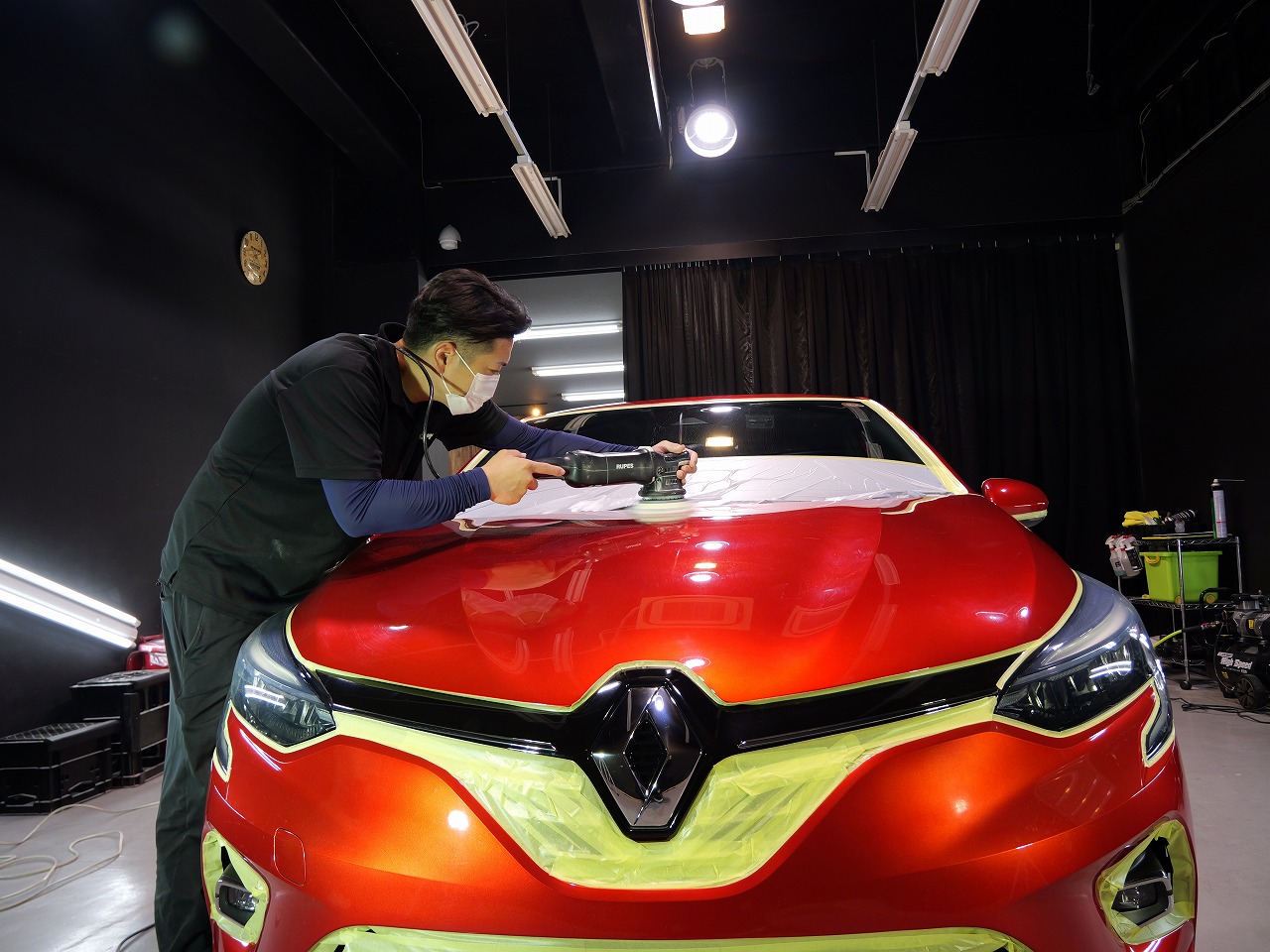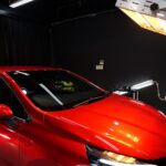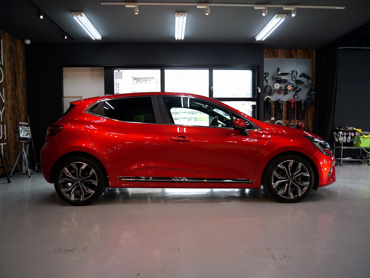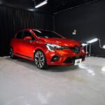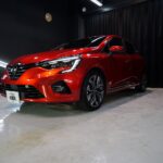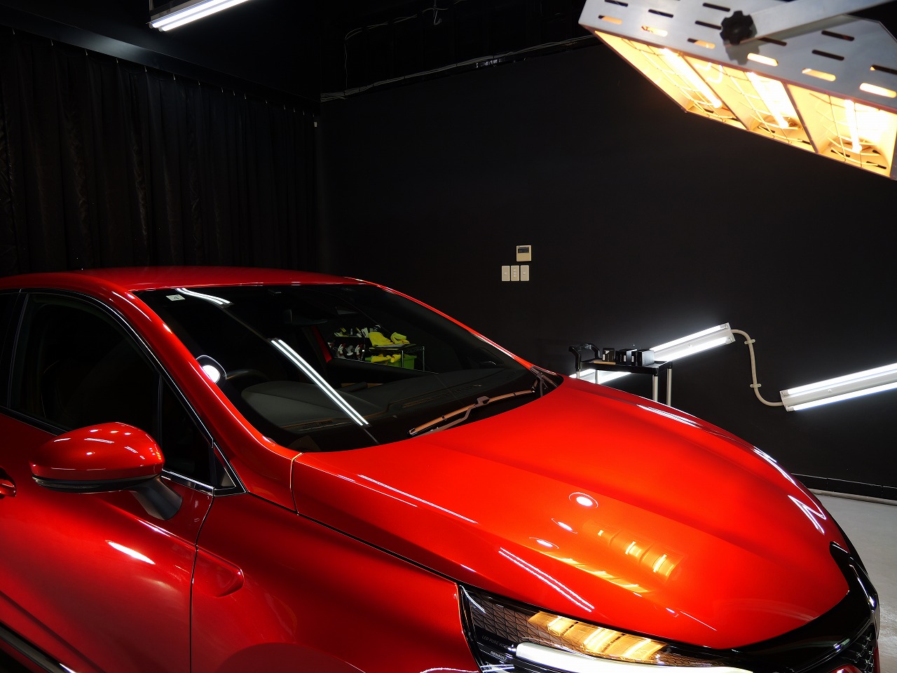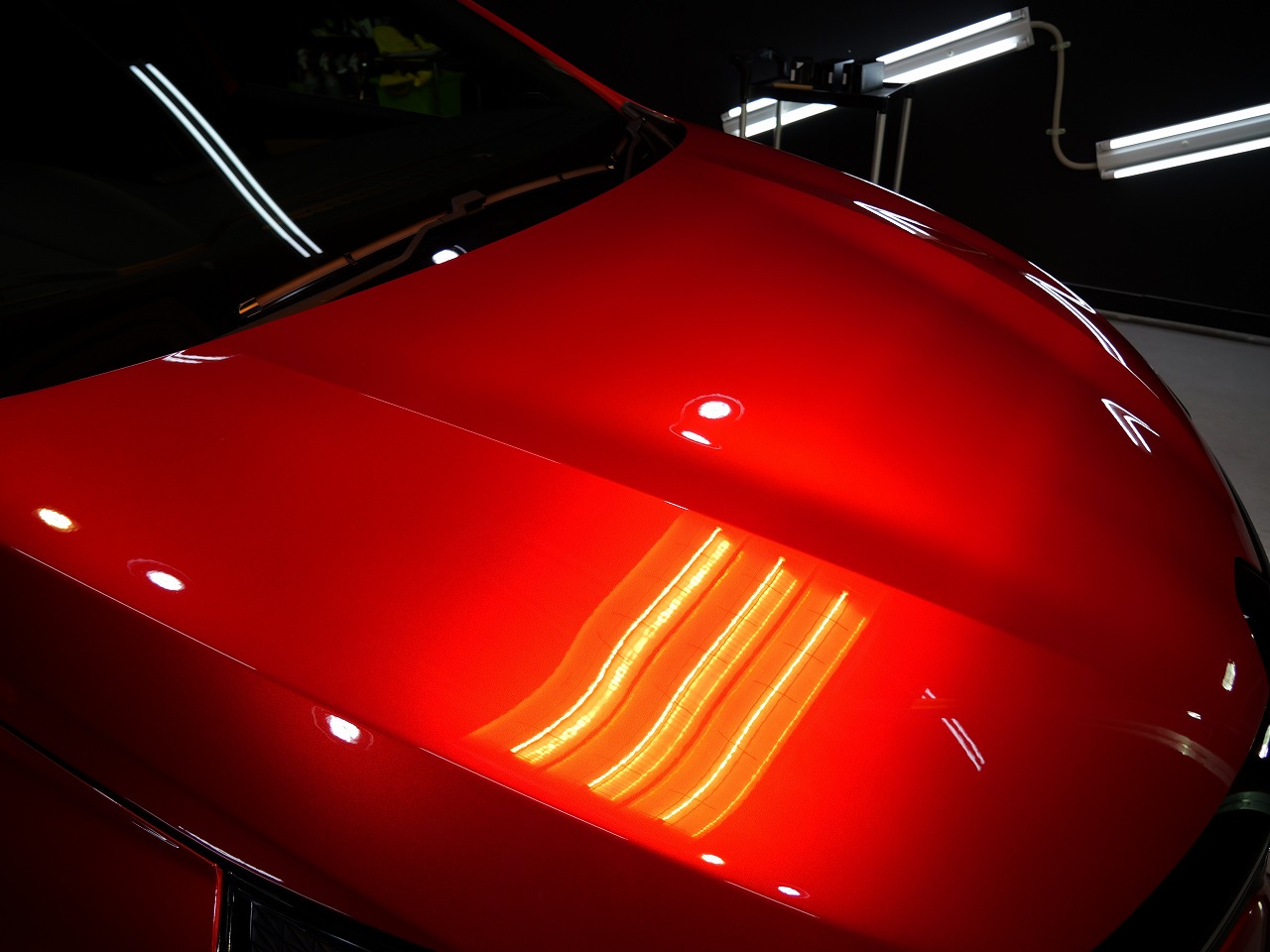ルージュフラムメタリック。施工はボディには完全無機質のクォーツガラスコーティング/ホイールコ